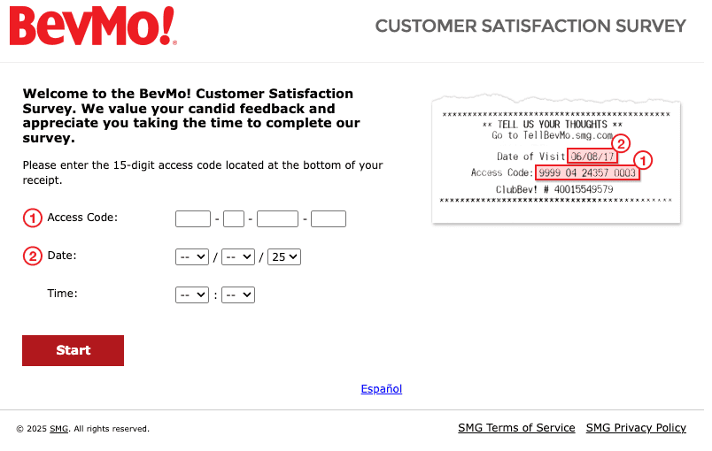 To get started, you’ll need a valid BevMo! receipt with a survey invitation. Then follow these steps: